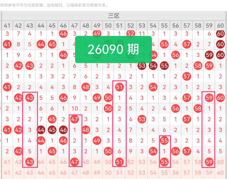 上期第三区间开奖个6号码,本期可能会减少开出。43紧邻上期开奖号码,依托邻号延续性,承接前期出号走势,不会出现号码走势断层;47属于区间冷温转换号码,经过合理周期的遗漏后,走势逐步回暖;51凭借跨区同尾联动优势,与其他区间同尾号码形成呼应,在整体开奖走势中,同尾号码联动是常见规律;55处于三区核心中段位置,是区间出号高频点位,近几期走势温和,没有大幅波动;59占据三区尾部,衔接四区号码,完善了区间首尾布局。