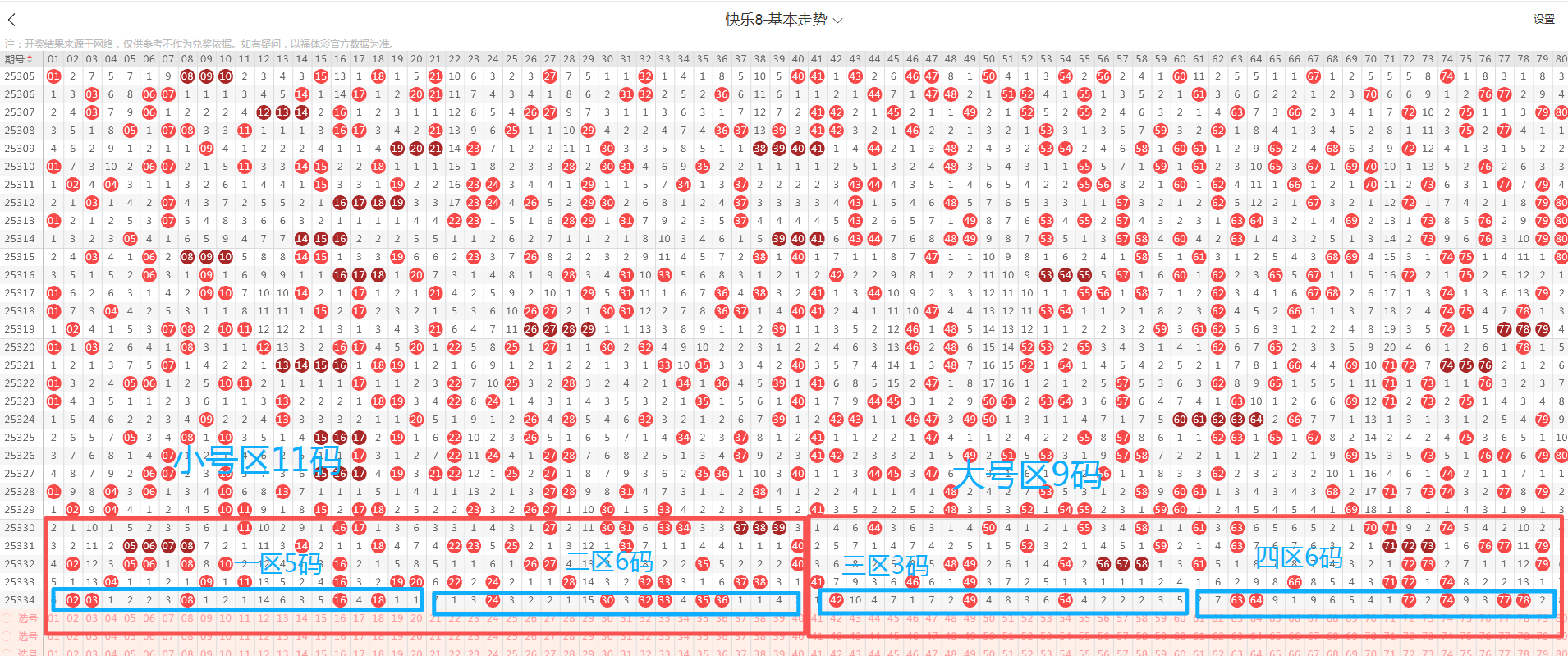 上图是快乐八2025334期区间走势图,从图中看到小号区(1-40)开出11个出奖号码,从开出数量上看与上期开出数量减少,热度上降温,从小号区近10期出号情况看,整体小号区前区近期偏温趋势;大号区(41-80)本期开出了9个出奖号码,从开出数量上看与上期开出数量增加,热度升温,从近期出奖号码个数看属于偏温态势,下期快乐八2025335期大号区号码大概率热度回温延续,大小区间主看大区号码热度回温概率较大,大小比具体区间比可参考11:9,防10:10的比例;再从细分区间来判断,按走势图四分区分成四个区间,一区(1-20)开出来的号码有5个;二区(21-40)开出来的号码有6个;三区(41-60)开出来的号码有3个 ;四区(61-80)开出来的号码有6个;数据上看本期出奖号码集中分布在二、四区。从号码落位区间形态上看,快乐八2025335期主看三、四区热度回暖的态势,落号几率较大,建议密切关注。