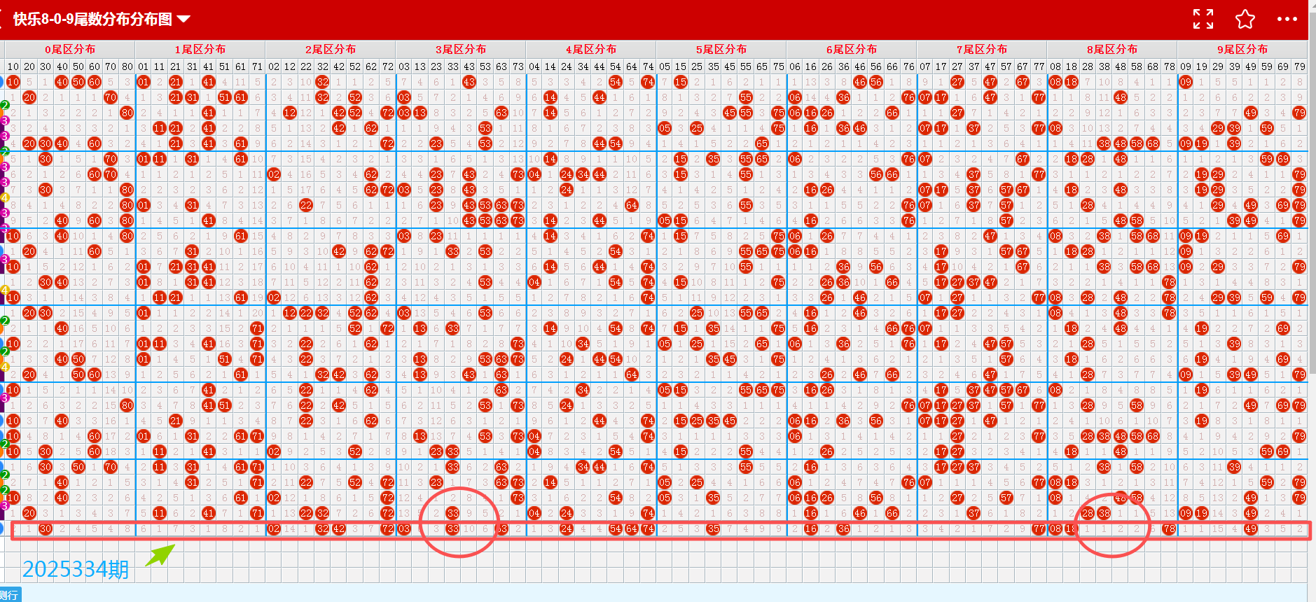 上图是快乐八2025334期的尾码走势图,从图中看0尾到9尾出号个数依次是:0尾号码区开出1个;1尾号码区开出0个;2尾号码区开出4个;3尾号码区开出3个;4尾号码区开出4个;5尾号码区开出1个;6尾号码区开出2个;7尾号码区开出1个;8尾号码区开出3个;9尾号码区开出1个;再看小尾号码(0尾-4尾)区有12码,大尾号码(5尾-9尾)有8码;数据比对统计后可以看到本期2、4尾出号数量最多,一共开出了8个中奖号码。本期1尾出现断区!由走势比对推断2025335期重点需要关注3、8尾区号码下号热度回补和落号数量增加的概率较大。