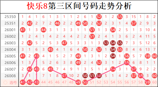 三区上一期布局六码直接拿下五码,尤其是区间上三连码的再次现身,与我们分析的全然是对的。第三区间思路延续强势,三连码爆发后能量未竭,本期仍有惯性出号空间。重点关注45-46-47、50-51双连码结构,尤其是50作为中轴号已沉寂三期,回补窗口已然打开。同时留意42与48的斜跳呼应,防范冷号43突然破位。结合上期五码落点,本期可侧重中段46-55区间布防,采取“重胆拖杀”策略,锁定47、50、55三大核心号,其中50具备冷转热的爆发潜力,极可能成为本期奇兵。不过前半部分隔期走势很显然是在本期回补的,这里可作为重点来对三区进行布局。