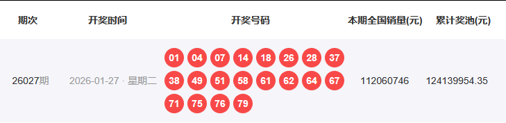 1、开奖号码:01 04 07 14 18 26 28 37 38 49 51 58 61 62 64 67 71 75 76 79