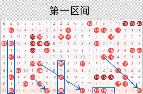 该区间的02号数字是属于121走势,本期我们要注意一下出号情况。本期的07号数字我们也是要注意了,由于上次没有出来,那么本期的出号情况是很大了。09号数字是属于空一对称类型,我们可以关注一下,还是有机会出号的。三连号14 15 16号数字我们要注意落下号码的情况,重点关注一下14 15的落号情况。本期的20号数字是属于断斜连对称号码,我们要注意一下出号的情况。