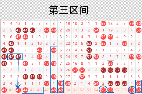 该区间的三连号44 45 46本期我们也是要注意落下号码的情况,重点关注一下44号数字的出号情况。上期开出了连号空一带号47 49 50号数字,本期我们要注意一下出现重号的情况。上期开出了三连号56 57 58号数字,由于前期的3组三连号都没有落下重号来,那么本期的三连号落下重的机会就大了,我们要注意一下。夹号55 59我们也是要关注一下,这里也是有机会出一个号码的。