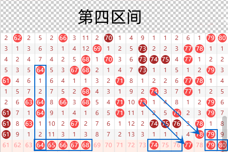 该区间的64号数字是属于空二对称号码,本期我们要注意出号情况了。该区间的62 65 68我们也是要注意了,它们是属于2路号码,也是遗漏3期没有出号了,我们本期要注意落下号码的情况。本期这里我们要注意一下64 65 66 67 68出现连号的情况,可以防守一下的。三连号74 75 76我们也是要注意落下一个号码的情况。77号数字我们要防守一下,对应的三斜连号码。