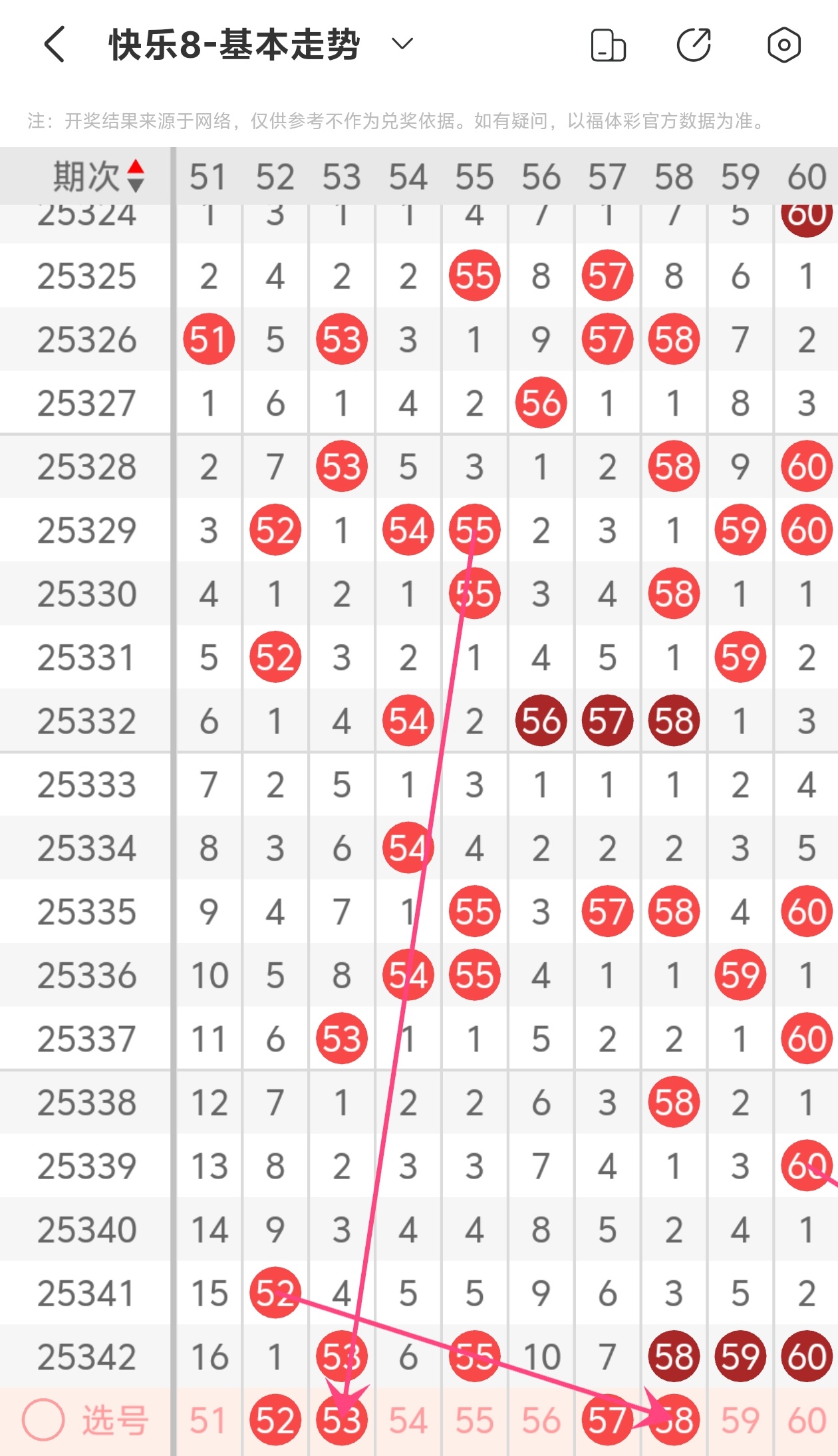 上期第六区间开出53 55 58 59 60,52为隔期回补走势,53为斜连走势,58为斜连走势,本期推荐52 53 58