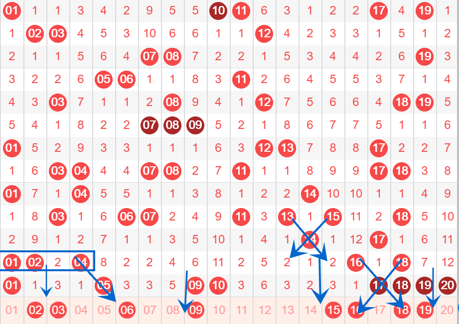 该区间的连号空一带号上期落下了重号01,那么本期我们就要注意一下02 04号数字的回补了。连号09 10我们也是要注意一下出重号的情况的。中心号对称13 14 15上期没能回补号码下来,那么本期我们就要注意一下回补号码的出号情况了。昨天开出了6连号17 18 19 20 21 22,本期我们做好防守出重号的情况,这里应该会出一个重号的。