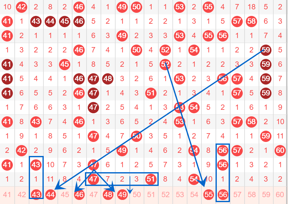 本期遗漏10期以上的号码有两个为44 55,本期我们要防守一下开出一个的可能,尤其是44号数字我们要重点关注一下。上期的47号数字开出来了,那么本期它的邻号46 48号数字我们就要注意了,出一个的机会还是非常大的。