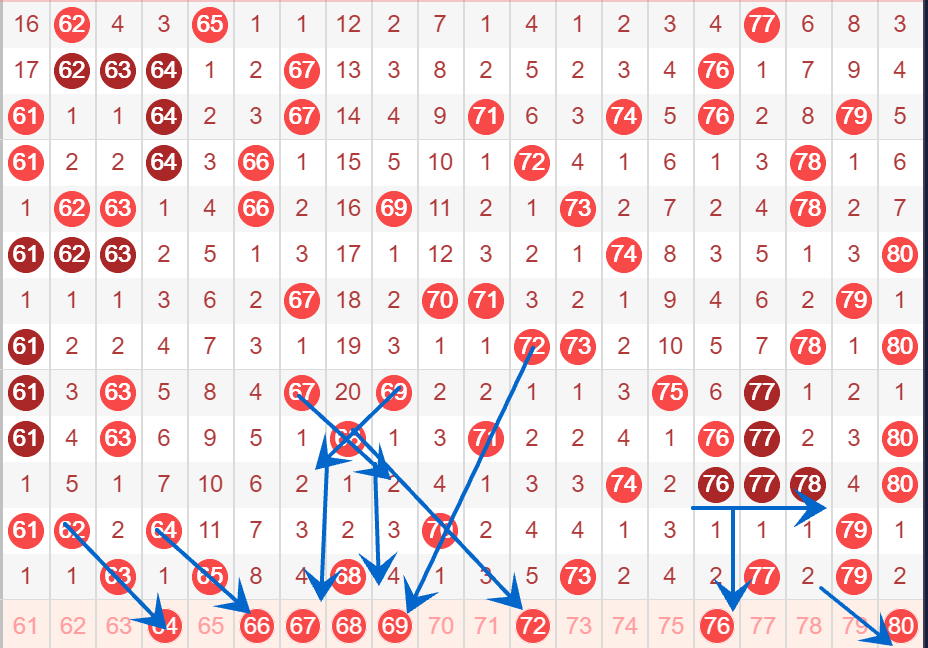 该区间的64号数字是属于梅花号,本期我们需要防守一下。上期中心号对称67 68 69回补了68号数字,那么本期的67 69我们就要注意回补一个的情况了。三连号76 77 78上期落下了77号,那么本期的76 78号数字我们就要注意,落下一个号码的机会还是大的。