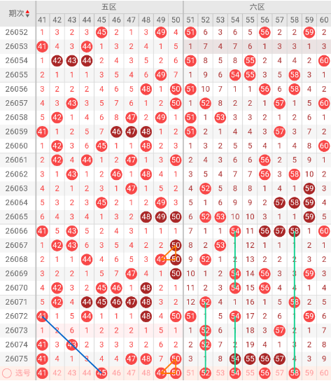 5-6区推荐号码如下:41、45、50、52、54、58