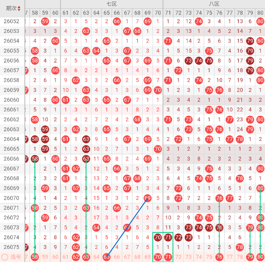 八区开出:78 奇偶比: 0:1 和值:78 跨度:0,上期开出1个号码,偶数。八区作为全盘的收尾,其出号形态呈现出强烈的两端挤压特征。也就是说,号码要么集中在71-74的前半段,要么集中在77-80的后半段,中间区域5-76反而相对真空。本期出号可能在1-2枚。