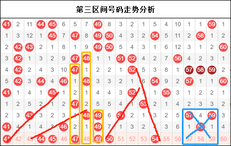 同样三区也是开出了四个号码,其中三个号码目标很明确,我就是补漏洞出来的,只有49是出现了三斜连,间隔六斜连的走势。本期重点四个号码出现四个断开,那今晚转战本区的可能性不太大,毕竟目前正处于一个循环中,所以本期依然不是主攻的一个方向,防守位倒是必不可少。这是对三区进行的一个预估,当然你要有什么好的想法,不妨一起说出来,我们看看有没有更好的看法。