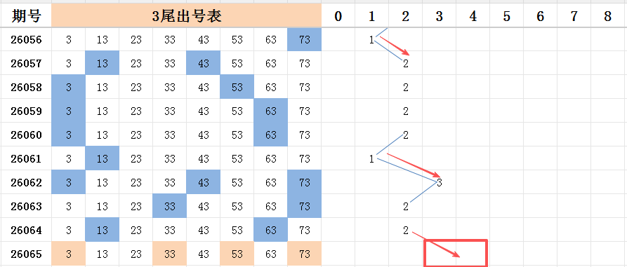 本期看好开出的范围是两码走势至四码走势之间。三尾上期开出二码走势,本期选择三尾的号码,首先考虑号码53的开出,是三斜连的号码走势,属于本尾比较有规律的号码走势,如果本尾能开出多码走势,那么有规律的号码大概率会开出。其次两个边码:号码03和号码73,走势都是比较不错的号码。