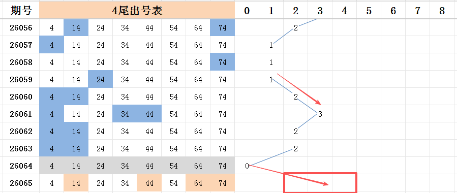 本期看好开出的范围是两码走势至四码走势之间。四尾上期开出断尾走势,四尾有四个冷码和四个热码。在选择号码的组合中,选择了两个热码:号码14和号码44的开出,分别是二区和五区的号码。看好两个冷码的尾号:号码64和号码74,看好能够开出其中一个。