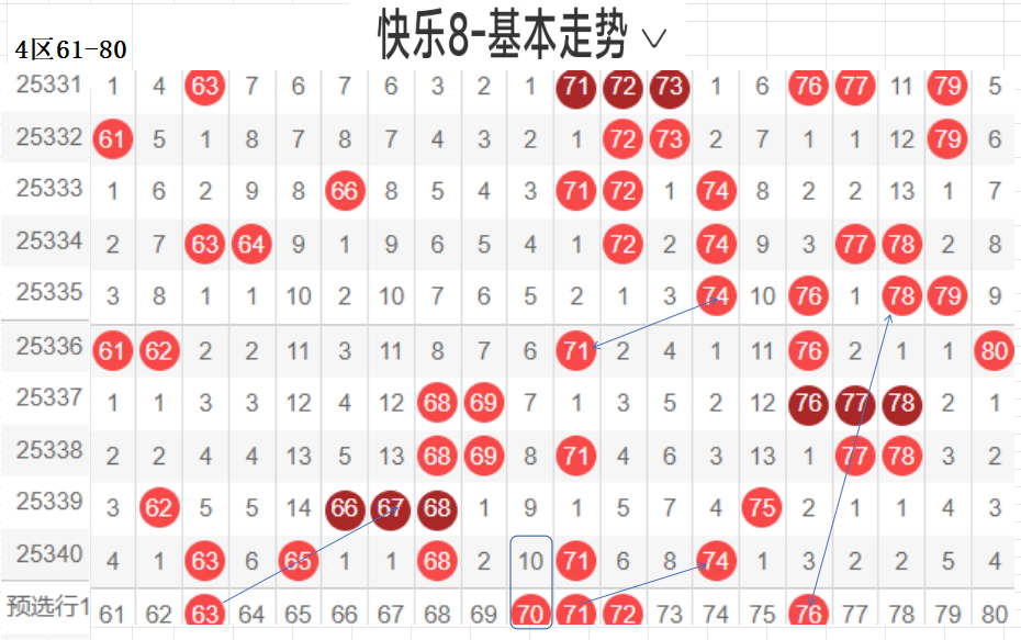 四区:(61-80):遗漏5(5)以下有16,063 65 68 71 74  5,平均温开方式,上期开出5,区间回暖,后区可防,区间从以往数据来看,重码很强,一枝独秀的存在,近期有回补走热的趋势,区间回暖,本区间后区可防,与一区相比,也是温区.,对称下落,隔期回补码,可以防,这区对呈对称三角关系的胆码,斜三连有走势的胆码,联动落位码,都有各自的走向落位关系,根据走势选择一种方式选码.