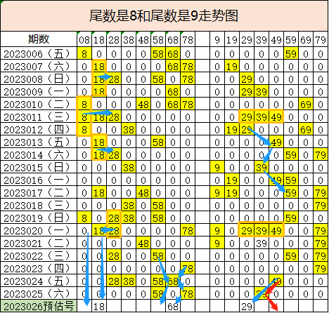 尾数8近20期也是热态尾数,根据走势图连号08,18,28,隔期重开的走势,