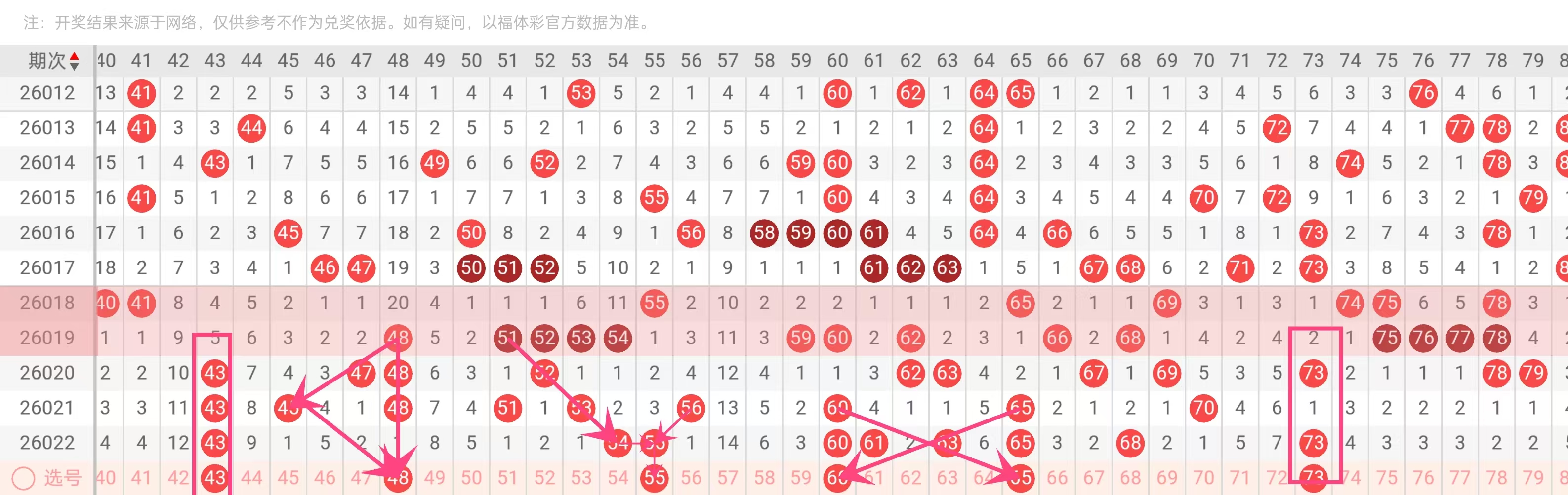5期出现2次(2026022、2026020),近期在70-79区间表现活跃。该区间在近5期均有号码开出,73作为该区间的中间号,出号节奏稳定。