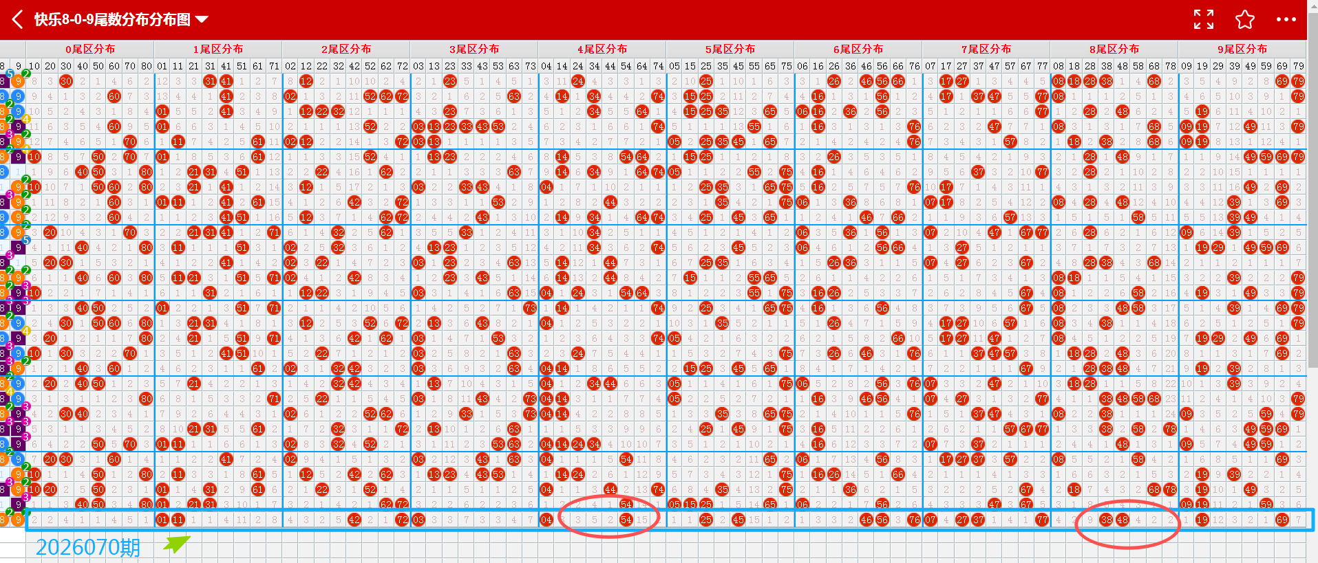 从2026070期重码走势图上看,画蓝色方框图标的是开出来的重码,开出了6个(蓝色方块标示的),重码数量与上期增加;从重码图上看,近10期重码下号数量有呈现升温的趋势。从近期重码下号数量的比对,可以发现中奖号码数量在1-10个号码之间均衡下号。综合推断本期重码热度回温概率极大,本期推断可以参考6个左右(蓝色箭头标示的);建议多加关注(04、07、38、48、69、76);