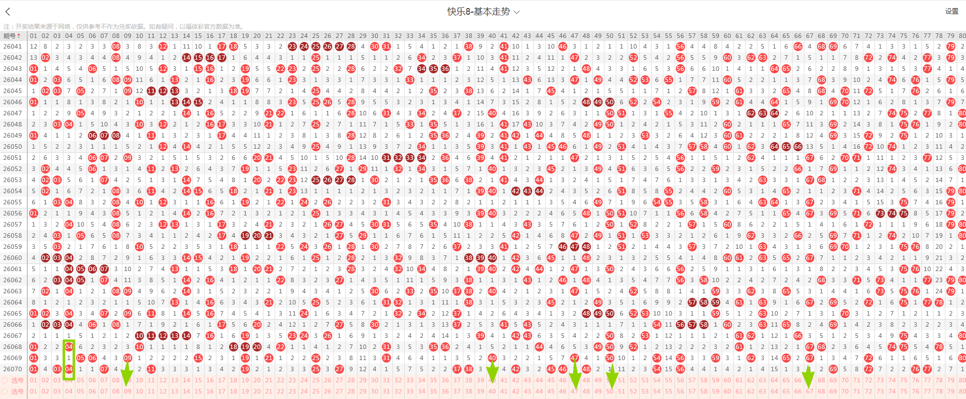 从这张走势图可以看到绿色方框标出来了遗漏一期的示意号码,开出了隔期(遗漏一期的)1个号码(绿色方块标示的),数量与上期减少,从近期走势图看隔期码回温态势形成,本期判断热度继续回温,落号5个号码概率较大(绿色箭头标示的09、40、47、50、67)需要关注,有下号概率;