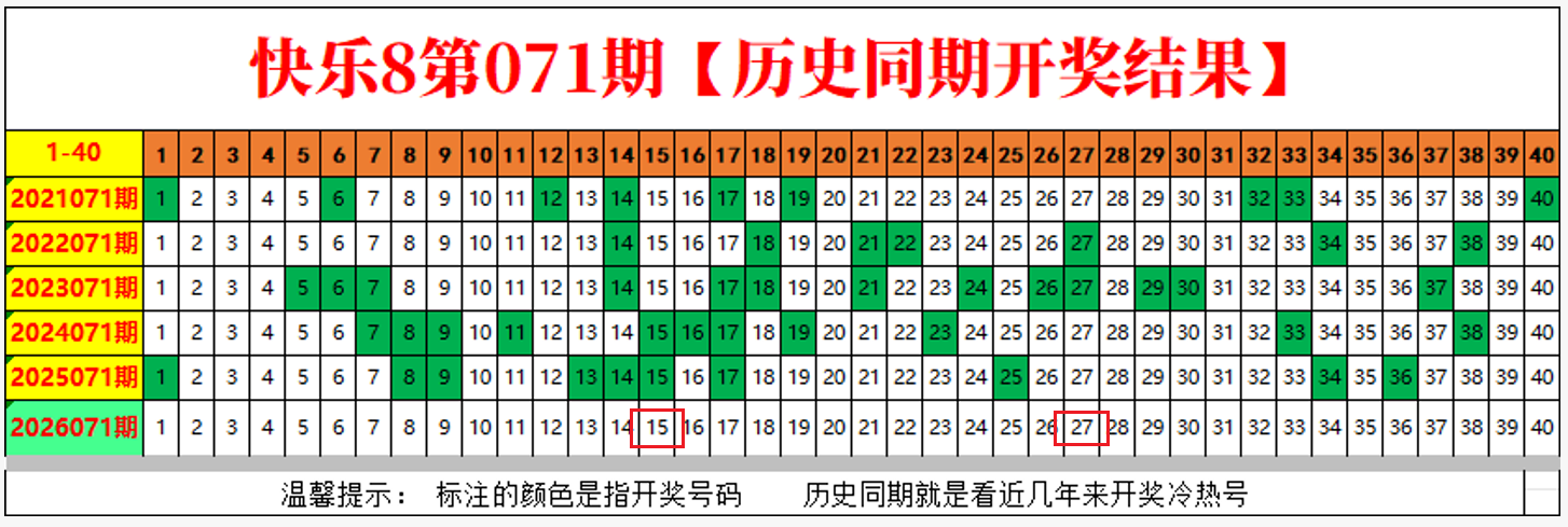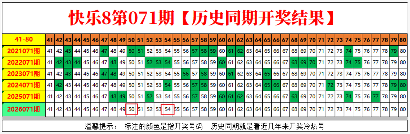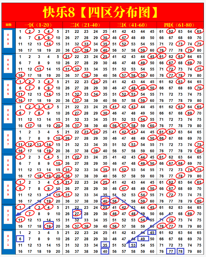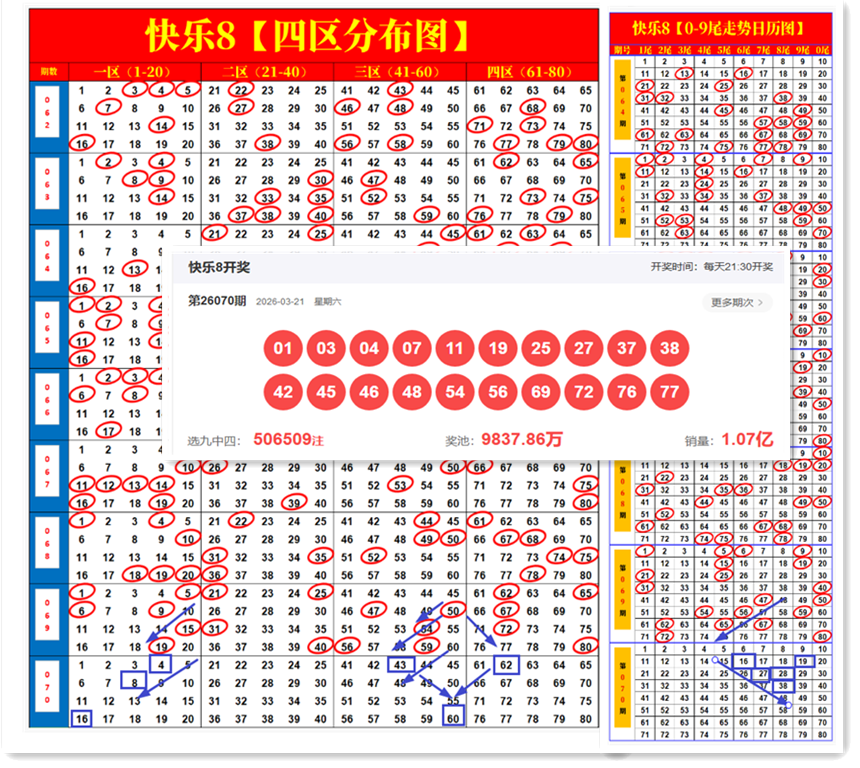 快乐8第2026071期尾号、四分区分析,上期开奖结果走势标记四码全对!