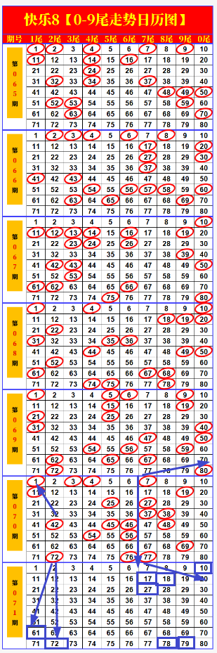 本期画线思路概括:以后尾号画线多呈现一些自己的看法和号码。如上图标记的,通过尾号走势图可以重点关注数字10,其次是61.72组合。本期7尾号组合属于备选号码,如果感觉可以的话也可以当成首选。对于70以后的数字,这几期可以重点关注下。