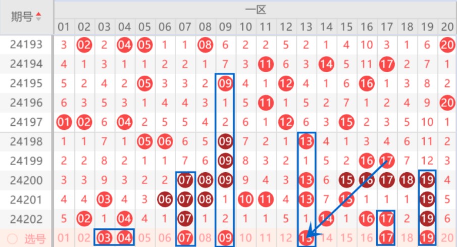 本期的03 04号数字我们注意一下出号情况,重点关注一下04号数字走重的情况。上期开出了07 19号数字的三重号,本期我们注意一下出一个四重号的情况,重点关注一下19号数字出现四重的情况。本期的09号数字我们关注一下出号情况,本期出号机会是很大的。上期开出了连号空一带号14 16 17号数字,本期我们注意一下出重号的情况,重点关注一下17号数字的出号情况。