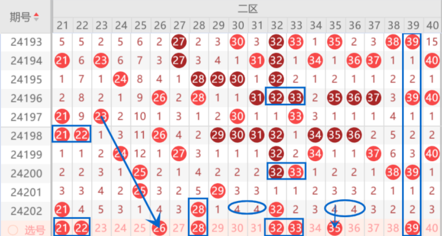 本期的21 22号数字我们注意一下同出的情况,毕竟是有机会复制上面的走势的。本期的26号数字我们注意一下出号情况,属于斜四连号码,出号机会还是有的。上期开出了28 32号数字,本期我们注意出一个重号的情况,如果本期的28 32出重了,那么本期的29 30 31号数字断号的情况就很大了,我们注意一下。连号35 36号数字我们注意一下出号情况,重点一下35号数字的出号情况。