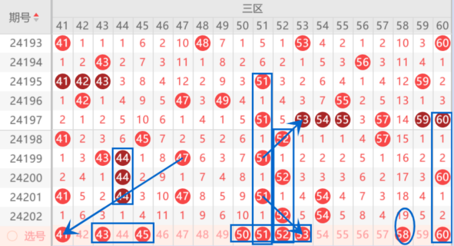 本期的41号数字我们注意一下出号情况,属于斜连号码,出号机会还是有的。本期的43 44 45号数字我们注意一下回补的情况,它们是属于三重号断号回补的号码,本期有很大可能是要出一个的,可以重点关注一下。本期的50号数字我们防守一下出号情况。本期的51 52 53号数字我们注意一下出三连号的情况,这里可以做一下防守。本期的58号数字是属于最大冷号,本期我们关注一下出号情况。本期的60号数字是属于空二对称号码,本期我们注意一下出号情况。