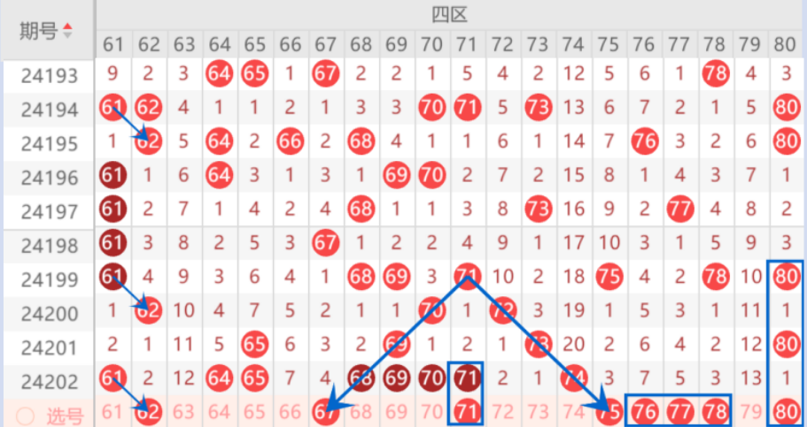 本期的62号数字我们注意一下出号情况,最近出61都是很容易把62号数字带出来的。本期的67号数字我们注意一下出号情况,本期可以防守一下67 75号数字同出的情况。上期开出了68 69 70 71号数字,本期我们注意一下出一个重号的情况,重点关注一下71号数字出重的情况。本期的78 80号数字我们注意一下同出的情况,本期可以防守一下。