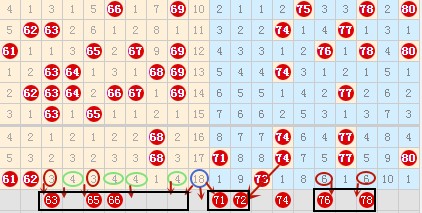 从上图中可以看到在62号到73号数字之间有3组同期遗漏值的数字,如果本期要出号的情况下,大可能的是出在这些数字上的,所以我们可以从64 66 67 69号数字选一个胆码出来,再从63 65号数字中选一个号码做参考。在上期70号这个冷号及它的邻号没有开出了,本期我们可以重点关注69 71号数字。上期中说72 73号这个连号是要落号了,果然上期落了73号数字,那么本期的72号数字能否落下来呢?我认为机会还是很大的,所以我们可以从71 72号数字中选一胆码了。在上图中76 78号数字也是同期遗漏值的,这里出号的几率也很大的,所以也可以从76 78号数字中选一胆码的。好了,本期分析就到这里了。