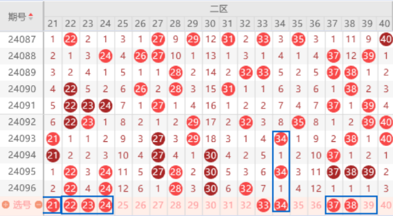 上期的22 24号数字都出重号了,本期我们注意一下出一个三重的情况。本期的23 29号数字都是属于重号的夹号,本期我们注意出一个号码的情况。上期开出了28 32号数字,本期我们注意出一个重号的情况。本期的33号数字是属于遗漏7期的号码,本期遗漏7期的号码有3个,我们要注意出一个号码的情况。三连号37 38 39号数字我们要注意落下一个号码的情况,重点关注一下37 38号数字的出号情况就行了。