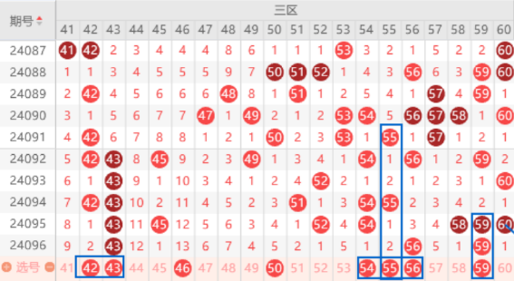 该区间的42号数字我们可以重点关注一下,这里可以防守一下42 43号数字同出的情况。本期的41 44 47号数字我们也是要注意一下的,属于1路号码,遗漏6期没有出号了,这里可以关注一下44 47号数字出一个号码的情况,44 46号数字又是该断区内的两个冷号,出一个的机会还是有的。本期的54号数字我们注意一下出号情况,和42号数字的走势有点像,我们要注意一下。本期的55号数字是属于空二对称号码,本期可以重点关注一下。本期的59号数字我们注意一下出3重的情况。