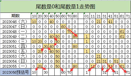 尾数1上期开出3个号码,这个尾数也精准命中2个号码,来看本期号码走势,在054期号码21隔期斜开上期号码11,落在本期号码01上面可以走出斜开三连号走势,在054期同期号码31斜开41斜开落在本期号码51上面会走出斜开三连号,在054期号码51往前斜开上期号码41斜开落在本期号码31上面会走出斜开三连号走势,号码54往后斜开上期号码61落在本期号码71上面也可以走出斜开三连号走势,这个尾数就看到了4个斜开三连号走势,这里值得关注的是号码01和31落在本期的优势。