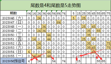 尾数4上期开出3个号码,在054期号码04斜开上期号码14落在本期号码24位置上可以走出三连号走势,而号码24重号开出在052期重号走势下也是很有优势的,在054期号码44斜开上期号码24落在本期号码04上面也会走出斜开三连号走势,上期号码44斜开本期号码54的二连号走势也有机会,而号码54,74在近10期遗漏最大,本期这两个号码可二选一落下开出的。