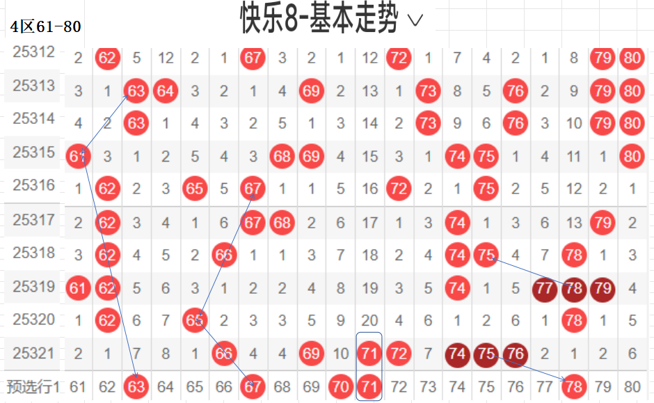 四区:(61-80):遗漏5(5)以下有15,066 69 71 72 74 75 76  7,平均温开方式,上期开出7,区间回暖,后区可防,区间从以往数据来看,重码很强,一枝独秀的存在,近期有回补走热的趋势,区间回暖,本区间后区可防,与一区相比,也是温区.,对称下落,隔期回补码,可以防,这区对呈对称三角关系的胆码,斜三连有走势的胆码,联动落位码,都有各自的走向落位关系,根据走势选择一种方式选码.