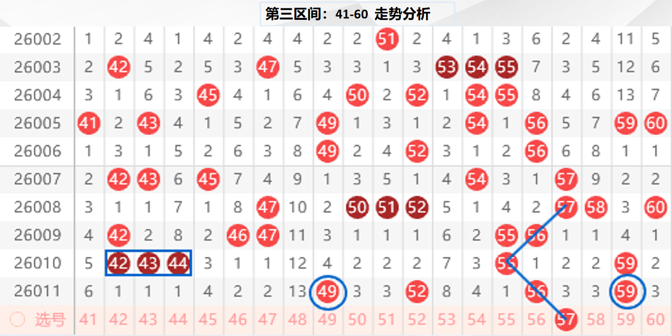 三区分析:【41-60】(走势图标注号码非小黄车大底,请谨慎参考,具体思路将在直播间分享讨论)