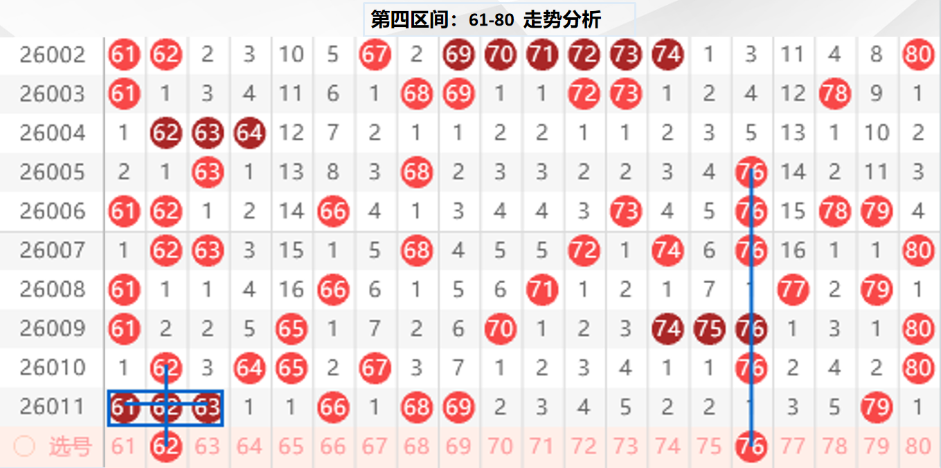 四区分析:【61-80】(走势图标注号码非小黄车大底,请谨慎参考,具体思路将在直播间分享讨论)