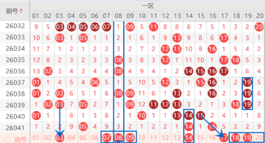 该区间的02 03号数字我们注意一下出一个号码的情况,其中的03号数子可以重点关注一下。本期的07 08 09号数字也是要注意出号情况,其中的07 08号数字或者08 09号数字我们可以防守一下同出的情况。本期的09 11号数字是属于交叉对称回补号码,出号机会是有的,可以关注一下。本期的14号数字我们可以关注一下出三重的情况。本期的18 19 20号数字是属于三重号码19号数字的回补号码,出号机会还有的,本期可以重点关注一下。