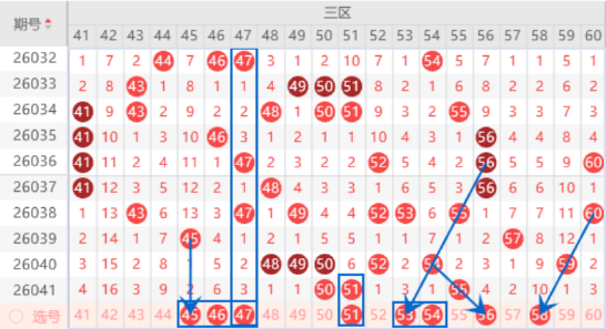 该区间的41 42 43 44号数字本期是有可能断号的,我们本期就观察一下就行了。本期的45 46 47号数字我们注意一下出一个号码的情况,其中的46 47号数字可以重点关注一下出号情况。本期的51号数字我们注意一下出重号的情况,本期可以防守一下51 53号数字同出的情况。本期的53号数字是属于四斜连号码,出号机会是有的,可以关注一下。本期的56号数字是属于三斜连,本期是有机会出号情况,本期可以防守一下56 58号数字同出的情况。