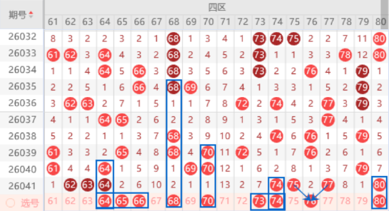 该区间上期开出来62 63 64号数字的三连号,本期我们注意一下出重号的情况,其中的64号数字我们防守一下出三重号码的情况。本期的68号数字是属于空二对称号码,出号机会是有的,可以防守一下68 70号数字同出的情况。本期的73号数字是属于空7对称号码,出号机会是有的,可以关注一下。上期开出了74 75 77号数字,本期我们防守一下夹号76号数字出号情况,本期的74 75号数字我们防守一下出重号的情况,其中的74号数字可以重点关注一下。