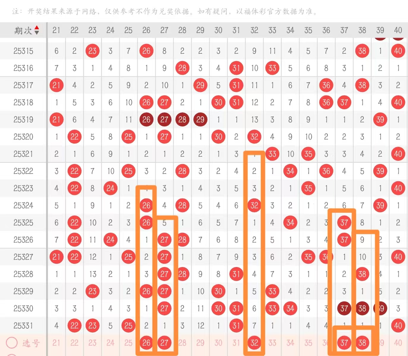二区21—40:整个2字头本期如果超形态的话,27的五重和前不久的62五重作为空一遗漏可以去关注,然后回到3字头上毕竟在出现井喷后,上期只给到了一码,本期在回补形态上至少可以做到2~3码,所以说空一的回补尽量以连号当中去为主,所以说37 38这两码比较明显,除此之外在三连的形态上面去选择的话,本期3~4码可以主做一码,所以说32是作为很干净的,因为在回补的区间是是很有特性的下号位置。