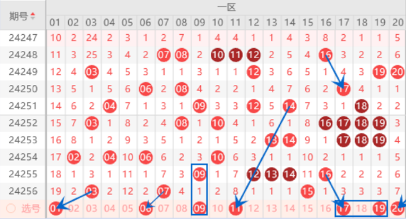 该区间的06 09号数字我们注意出一个号码的情况,上期开出了03 07号数字,那么本期的02 04 06 08号数字是要出号码的,所以本期的06号数字我们可以关注一下,本期的09号数字是属于空一出号,本期的三连号12 13 14也是空一出号,本期这里是不一定会出号码的,所以本期的09号数字就有出号机会了。本期的17 18 19号数字我们注意一下出号情况,属于重号18号数字的边号回补号码,本期可以重点关注一下17 19号数字出一个号码的情况。