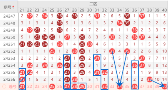 该区间上期开出了21 27 28 38号数字,本期我们要注意一下继续出重的情况,其中的21号数字我们注意一下走三重的情况,27号数字注意一下出5重号的情况,做一下防守就行了,连号空一带号29 31 32号数字我们注意一下出号情况,其中的29号数字是属于V型号码,出号机会是有的,32号数字在尾数上是属于三连号12 22 32号数字的落号情况,所以本期的32号数字也是有出号机会的,我们可以关注一下。
