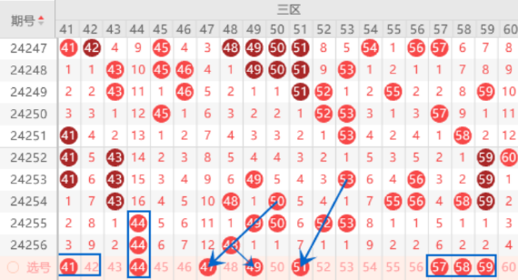 本期的40 41 42号数字我们要注意落下一个号码的情况,都是属于重号41号数字的边号回补号码,其中的42号数字是属于属于遗漏9期的号码,本期出号机会不是很大,我们可以直接放弃了,重点关注一下40 41号数字出一个号码的情况就行了。上期49 50 52 53号数字没能开出重号来,本期我们要注意一下出一个重号的情况,重点关注一下49 53号数字出重的情况就行了。