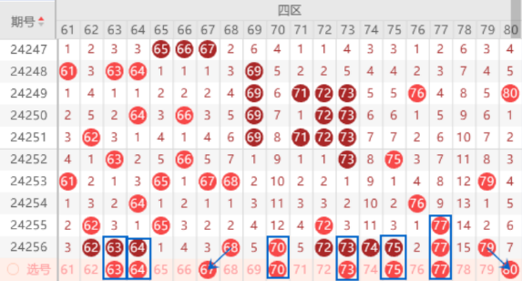 上期开出了三连号62 63 64号数字,本期我们注意一下出一个重号的情况,又由于上期开出的63 73号数字,73号数字又是四连号72 73 74 75号数字中的号码,所以本期的63 73号数字是有很大机会开出一个号码来的,我们要注意一下,本期的64 74号数字也是和73 74号数字一样,我们也是要注意开出一个重号的情况。上期开出了68 70 72号数字,其中的70号数字我们注意一下出重号的情况。