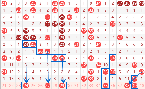 连号24 25和连号26 27和连号28 29号数字本期应该是要落号了,这里我们要重点注意了,这里可以做一个选三复式的,这里可以重点关注一下24 27 29号数字。连号空一带号33 35 36上期出了33号数字的重号,有点意外,那么本期我们就要注意一下35 36号数字的落号情况了。本期的38号数字我们要关注一下,还是有机会出号的。