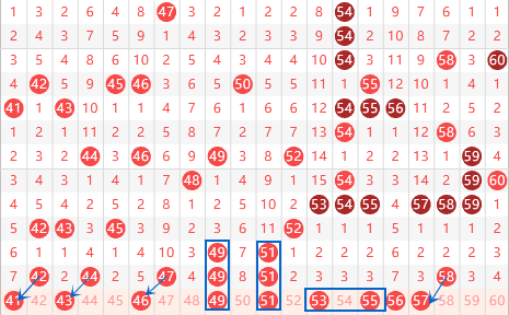 上期的44 47号数字开出来了,那么本期我们就要注意一下41号数字的出号情况了。本期的夹号43号数字我们也是要注意一下的,本期可以小做,本期不出,下期我们就做胆码就行了。本期的46号数字我们也是要注意的,上期开出了47号数字,很有可能把本期的46号数字带出来的。上期开出了49 51号数字的重号,那么本期我们就要注意这里出现三重的情况了。连号53 54 55本期我们要注意落号了,重点关注一下53 55的出号情况就可以了。本期的57号数字我们可以关注一下,上期开出的58号数字有可能会分边。