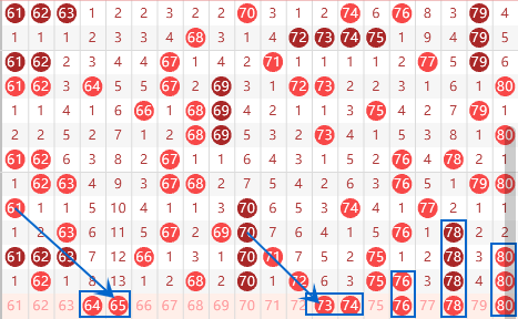本期的65号数字我们可以防守一下,它是属于三斜连号码,出号机会还是有的,注意64 65同出的情况。本期的73号数字是属于4斜连号,本期我们关注一下,这里不出73就会出74,可以在这里定一胆码的。本期的76号数字我们要注意出重的情况,78号数字我们注意出现4重的情况,80号数字我们注意一下出现3重的情况,这里的76 78 80可以做一组防守号码来用的。