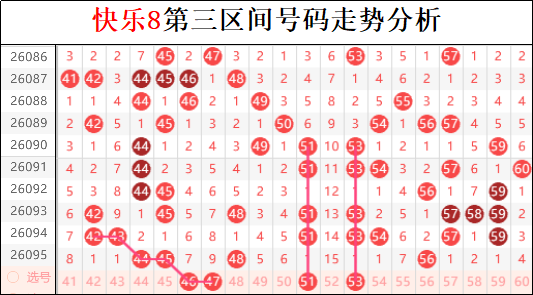 三区上一期由于重号的强势走位,导致上一期的布局上重号全部消失,且连续两期的多码走势后,区间第三期直接转弱。本期三区的走势比较鲜明,尤其是隔期走势将变得异常活跃,这也对本期的选择有了风险走势。本期三区面临重号是否回补的走势,尤其是斜连形态的再次下拉,一旦区间主线不明,本期三区的走势将无从下手,甚至不排除三区再次降温的走势出现。尤其是前半部分的阶梯下拉走势,绝对是最坑的走势,毕竟近期各个区间的阶梯走势基本是没有下来走势的。因此三区策略必须转向“守正出奇”:放弃对斜连的盲目追逐,聚焦41-48段隔期热码与50-59段冷码补位的双重博弈。44、47、53、58四码已形成隐性共振,其中53号连续三期间隔出现,本期极可能完成斜连闭环;而48号作为隔期枢纽,一旦激活,将带动前半段整体升温。切忌在阶梯陷阱中反复试错——三区不是退场信号,而是形态重构的起爆点。