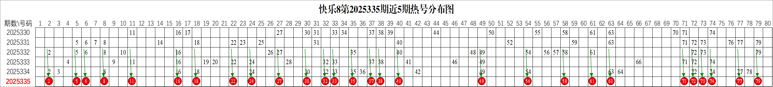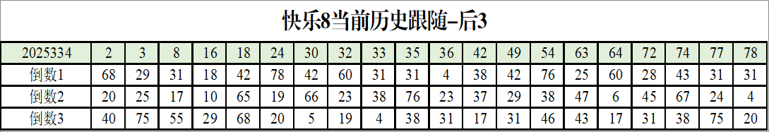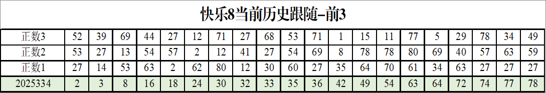 我感觉选热的同时,还要注意防冷条件开出,可以直接选取每个号码跟随出次前三的号码,也可以考虑把出次最后的三个数字加进去,不过这样可能号码太多,可以尝试。图上也能看出单独号码跟随的情况,我就不一一统计每个号码的出次了,我这里考虑提高概率,取每个号码历史跟随的前三号码和后三号码,根据2025334期的号码,我关注正数3和倒数3的号码号码为: