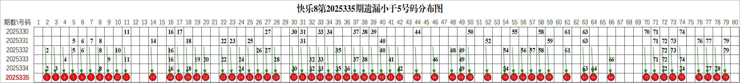 所以这个条件值得关注,从号码分布图上我们可以分析出,遗漏小于5期的号码有: